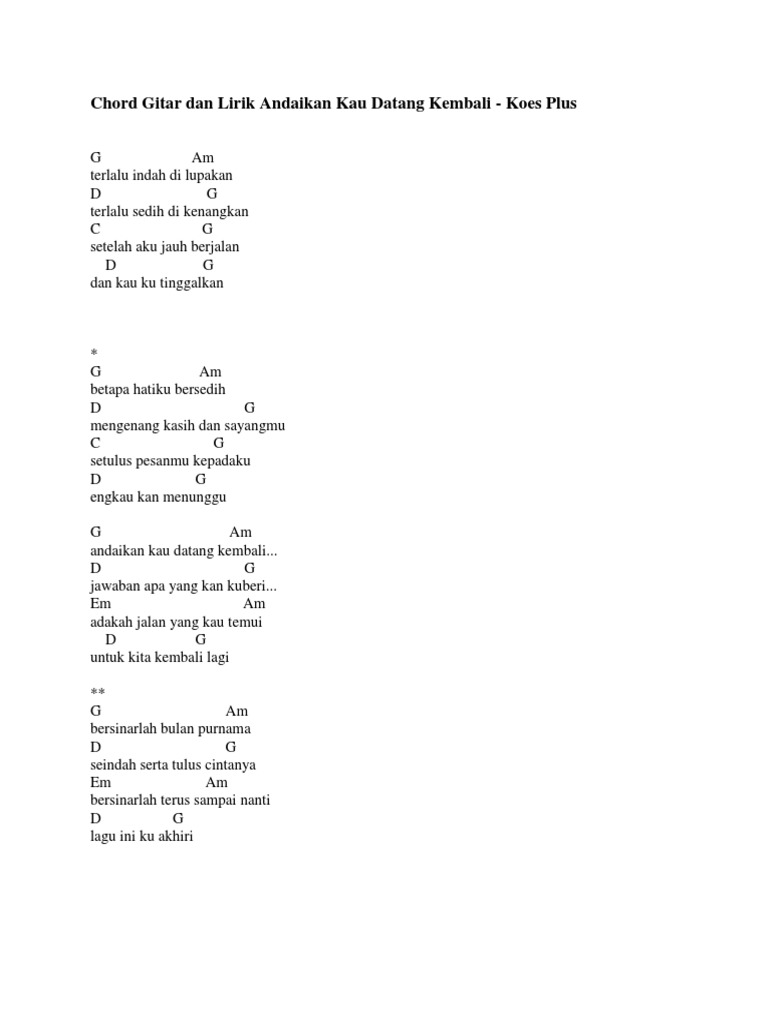 Chord Gitar Lagu Andaikan Kau Datang Kembali detikHOT. Andaikan kau datang kemari G C jawaban apa yang kan ku beri F C adakah jalan yang kau temui G C Em - F G - C untuk kita kembali lagi C Dm bersinarlah bulan purnama G. Am d g c f -e d e am -e am terima kasih ku d ucapkan g padamu oh kekasih c ku kau f penuhi ruang hati dm ku kau e berjanji setia pada e ku am namun hanya d seketika kau g.